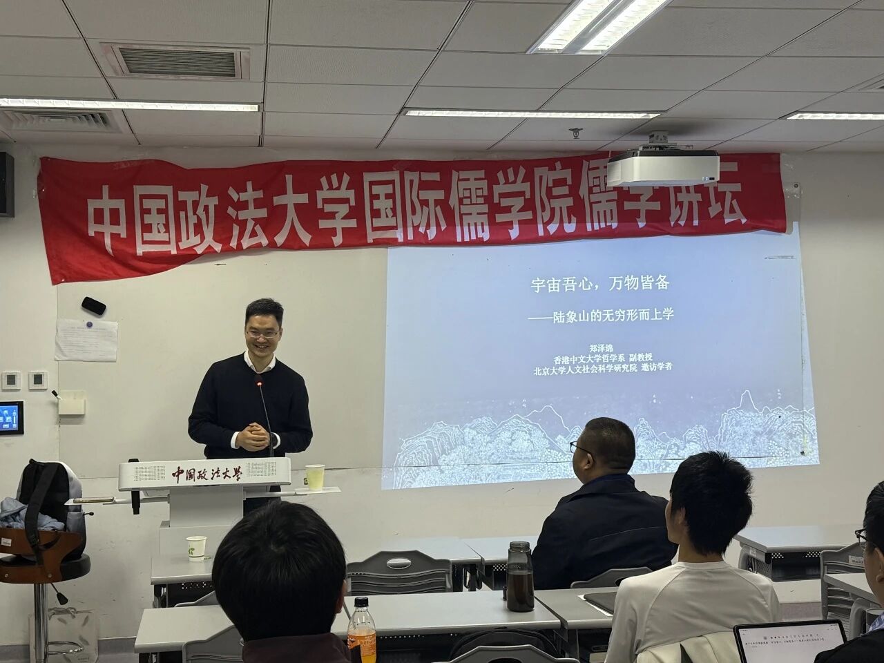 2025年11月12日晚,中国政法大学国际儒学院儒学讲坛第一百二十六讲顺利举办。本次讲座的题目为《宇宙吾心,万物皆备——陆象山的无穷形而上学》,主讲人为香港中文大学副教授、北京大学人文社会科学研究院邀访学者——郑泽绵老师。本次讲座由中国政法大学人文学院副教授孙国柱主持。