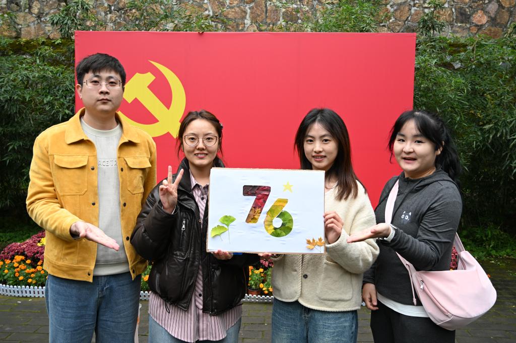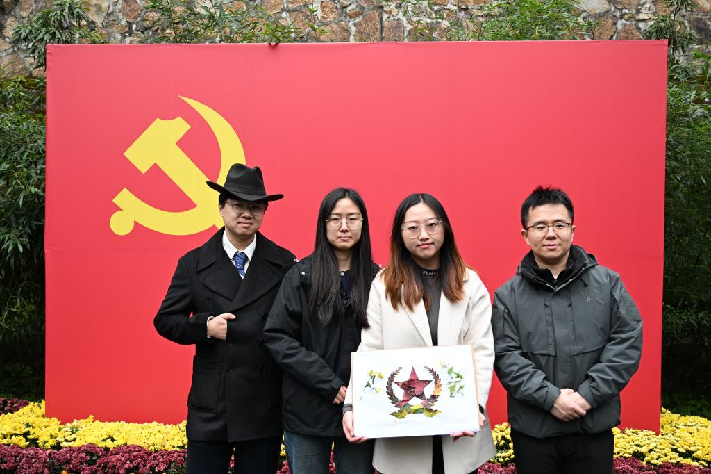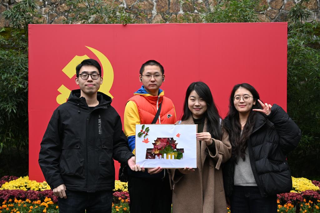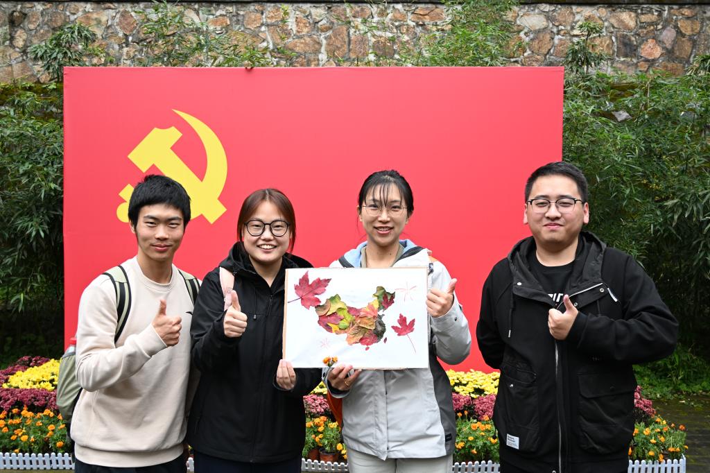 中午 12 时,师生们在短暂休息和用餐后,开启了有趣的 “枫叶映丹心”树叶拼贴画游戏环节。全体成员一共分为五个小组,各小组迅速分工协作,以参观沿途收集的落叶为主要素材,创作出了一幅幅充满红色寓意的树叶拼贴画作品。创作完成后,各组依次分享了作品内涵与象征意义。在现场热烈的合作交流中,大家不仅加深了对中央八项规定精神以及党史的了解,更增进了同学情谊。